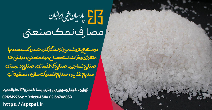 نمک صنعتی دارای مصارف زیادی می باشد از جمله در صنایع پتروشیمی (تولید گاز کلر، هیدروکسید سدیم)، متالوژی و فرآیند استحصال مواد معدنی، دباغی ها، صنایع نساجی، صنایع کاغذسازی، صنایع داروسازی، صنایع غذایی، صنایع لاستیک سازی، تصفیه آب، خوراک دام، صابون سازی و پودرهای شستشو، عملیات حفاری چاههای نفت و گاز
